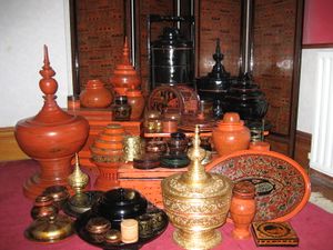 The most distinctive vessel is probably a rice bowl on a stem with a spired lid for monks called hsun ok. Lahpet ok is a shallow dish with a lid and has a number of compartments for serving lahpet (pickled tea) with its various accompaniments. Stackable tiffin carriers fastened with a single handle or hsun gyaink are usually plain red or black. Daunglan are low tables for meals and may be simple broad based or have three curved feet in animal or floral designs with a lid. Water carafes or yeidagaung with a cup doubling as a lid, and vases are also among lacquerware still in use in many monasteries.[11][12]
