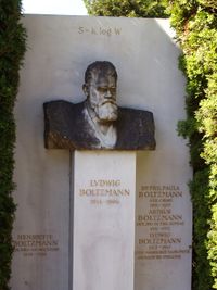 قبر بولتسمان في Zentralfriedhof, ڤيينا، بتمثال نصفي وصيغة الإنتروپية.