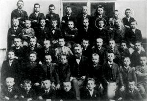 Class photograph at the Realschule in 1901, a young Adolf Hitler in the last row on the right. In the penultimate row, third from the right, a student whom is believed to be Ludwig Wittgenstein.