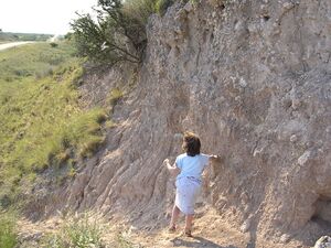 The loess along the Mississippi River near Vicksburg, Mississippi, consists of three layers. The Peoria Loess, Sicily Island Loess, and Crowley's Ridge Loess accumulated at different periods of time during the Pleistocene. Ancient soils, called paleosols, have developed on the top of the Sicily Island Loess and Crowley's Ridge Loess. The lowermost loess, the Crowley's Ridge Loess, accumulated during the late Illinoian Stage. The middle loess, Sicily Island Loess, accumulated during the early Wisconsin Stage. The uppermost loess, the Peoria Loess in which the modern soil has developed, accumulated during the late Wisconsin Stage. Animal remains include terrestrial gastropods and mastodons.[44]