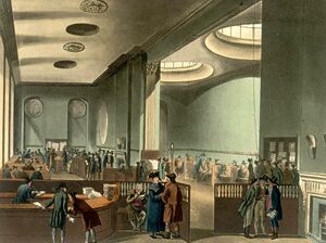 Just after Christmas 1691, the small club of marine insurance underwriters relocated to No. 16 Lombard Street; a blue plaque on the site commemorates this. This arrangement carried on until 1773, long after the death of Edward Lloyd in 1713, when the participating members of the insurance arrangement formed a committee and underwriter John Julius Angerstein acquired two rooms at the Royal Exchange in Cornhill for "The Society of Lloyd's".[10] In July 1803, the Lloyd's Patriotic Fund was established by a group of Lloyd's underwriters.[11][12][13]
