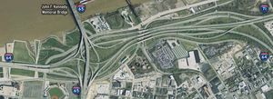 The downtown business district of Louisville is located immediately south of the Ohio River and southeast of the Falls of the Ohio. Major roads extend outwards from the downtown area in all directions. The airport is about 6.75 ميل (10.86 km) south of the downtown area. The industrial sections of town are to the south and west of the airport, while most of the residential areas of the city are to the southwest, south, and east of downtown. In 2010, the 22,000-seat KFC Yum! Center was completed.[35][36] Twelve of the 15 buildings in Kentucky over 300 أقدام (91 m) are located in downtown Louisville.