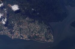 From north to south, major districts of the city are the residential area Batterie IV, Quartier Louis (known for its nightlife), Mont-Bouët and Nombakélé (busy commercial areas), Glass (the first European settlement in Gabon), Oloumi (a major industrial area) and لالالا، a residential area. The city's port and train station on the Trans-Gabon Railway line to Franceville lie in Owendo, south of the main built-up area. Inland from these districts lie poorer residential areas. North-west of Equatorial Guinea is where the city stands, labeling the city as a part of north-west Gabon. In terms of the country's surrounding boundaries, north is Cameroon, east is Congo, and south-east is the Democratic Republic of the Congo. It also rides the shores of the South Atlantic Ocean, which is on the country's west coast for reference. Additionally, in terms of aquatic geography, the Komo River passes through the city and empties into the ocean. The Komo River also stands as a potential hydroelectric source of power for the city which could generate supportive amounts of energy and power. Several city districts provide distinct and separate benefits throughout the city as well. In terms of nightlife, the Quartier Louis sector is most renowned. One of this zone's sides includes the coast, and this heavily influences the possible activities available in the area. Commercial areas within Libreville are housed in the Mont-Bouët and Nombakélé districts, which feature several shopping centers and stations selling purchasable goods. Oloumi contains much of the city's industry, integrating production separately from the districts that focus upon other aspects. Finally, Lalala and Batterie IV are residential and housing sectors, where much of the populace resides.[5]