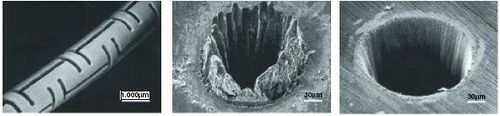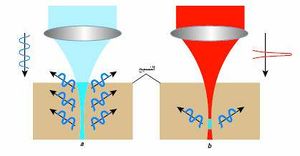 أما حين تركز مثل هذه الاستطاعات العالية في بقعة صغيرة فإنها تذري العديد من المواد مما يجعل النبضات البالغة القصر أداة للتصنيع الآلي الميكروي وللثقب والقطع واللحام. ويمكن أن تفوق الدقة أبعاد بؤرة الحزمة إذا اختيرت شدة النبضة بعناية بحيث لا يزيد سوى الجزء المركزي الأشد لمعانا من الحزمة على عتبة تذرية المادة. تودع النبضة الطاقة في البؤرة بسرعة أكبر بكثير من سرعة انتشار الحرارة إلى المناطق المجاورة غير المعرضة للإشعاع، ويضمن ذلك الحصول على أشكال ناعمة ودقيقة [انظر الشكل العلوي في الصفحة 65]. وقد أثبت الباحثون نجاح هذه التقنية بأن قطعوا بدقة الألماس وكربيد التيتانيوم ومينا الأسنان. ومما يثير الدهشة أنه يمكن لليزرات أن تقطع حتى المواد الشديدة الانفجار إلى شرائح. فهي تبخر ما هو عند نقطة القطع من دون أن تفجر المواد المحاذية. ويمكن أن تكون هذه الطريقة عملية في إتلاف الأسلحة والتخلص منها.