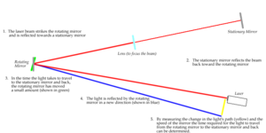 وكان الأول في سباق بينه وبين فيزو Fizeau لقياس سرعة الضوء في الماء وفي الهواء بهدف المقارنة بينهما، وقد أعاد فوكو عام 1862 قياسه سرعة الضوء في الهواء باستخدامه تقانة المرآة الدوراة الموضَّحة في الشكل (1)، وحصل بهذه الطريقة على نتيجة لا تختلف عن أدق القياسات وأحدثها بأكثر من 0.06. وفيه تُضبط سرعة دوران المرآة حتى يرى الراصد باستمرار الضوء المنعكس عن المرآة الثابتة التي تبعد عن المرآة الدوارة مسافة تساوي 22 ميلاً. وممَّا يساعد على ذلك استخدام منبع ضوئي شديد إضافة إلى عدسة لتجميع الضوء المنعكس عن المرآة الثابتة.