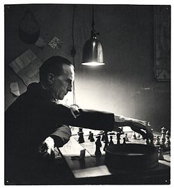 مارسل دوشان يلعب الشطرنج في 1952. (Kay Bell Reynal صورة ل مؤسسة سميثسونيان أرشيفات في الفن الأمريكي.)