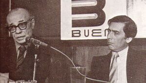 الكاتب الأرجنتيني إرنستو ساباتو (يسار) مع ماريو بارگاس يوسا (يمين) عام 1981.