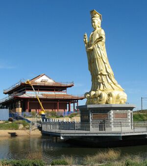 Today, Mazuism is practiced in about 1500 temples in 26 countries around the world, mostly in the Sinosphere or the overseas Chinese communities such as that of the predominantly Hokkien Philippines. Of these temples, almost 1000 are on Taiwan,[40] representing a doubling of the 509 temples recorded in 1980 and more than a dozen times the number recorded before 1911.[1] These temples are generally registered as Taoist, although some are considered Buddhist.[10] There are more than 90 Mazu Temples in Hong Kong. In Mainland China, Mazuism is formally classified as a cult outside of Buddhism and Taoism, although numerous Buddhist and Taoist temples include shrines to her. Her worship is generally permitted but not encouraged, with most surviving temples concentrated around Putian in Fujian. Including the twenty on Meizhou Island, there are more than a hundred in the prefecture and another 70 elsewhere in the province, mostly in the settlements along its coast. There are more than 40 temples in Guangdong and Hainan and more than 30 in Zhejiang and Jiangsu, but many historical temples are now treated as museums and operated by local parks or cultural agencies. From the early 2000s, pilgrimages from Taiwan to temples in Fujian have been permitted, particularly to the one in Yongchun, where Taiwan's Xingang Mazu Temple has been allowed to open a branch temple.[41] The A-Ma Temple on Macao Island is the probable source of its name in Portuguese and English; the historic and protected Tin Hau Temple, Causeway Bay in Hong Kong is the source of the Tin Hau area's name from the Cantonese pronunciation of one of Mazu's titles, "Empress of Heaven". The Mazu temple in Melbourne is the largest Chinese temple in Australia.