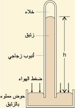 وهناك نوع آخر بسيط ودقيق من الأنبوب ذي الشعبتين، تكون فيه إحدى شعبتيه مائلة على الشاقول بزاوية كبيرة، وفي هذه الحالة يولد تغير صغير في الضغط في الشعبة الشاقولية تغيراً كبيراً يسهل قياسه في الشعبة المائلة. أما مقياس الضغط الجوي الزئبقي barometerفقد ابتكره توريشلي ويستعمل لقياس الضغط الجوي. ولما كان الضغط الجوي يتناقص بالارتفاع عن سطح الأرض، فإن مقاييس الضغط الجوي تدرج عادة لتعطي الارتفاع عن سطح الأرض كذلك. وهو نوعان: زئبقي وجاف aneroid. ففي النوع الأول يقاس الضغط الجوي عن طريق قياس ارتفاع عمود الزئبق الذي يوازن ضغط الهواء، وأما في النوع الثاني فتستعمل أغشية معدنية لهذه الغاية. فإذا ملئ أنبوب مغلق من أحد طرفيه طوله متر بالزئبق، ثم نكس على حوض من الزئبق من دون السماح للهواء بالدخول إلى الأنبوب، كما هو مبين في الشكل (2)، فإنه يحصل على مقياس للضغط الجوي. وهنا يوازن الهواء على الطرف الحر من حوض الزئبق عمود الزئبق في الأنبوب. فإذا زاد الضغط الجوي انخفضت سوية الزئبق في الحوض قليلاً وازداد ارتفاع الزئبق في الأنبوب المنكس بوضوح. ويقاس الضغط الجوي عندها بمقدار ارتفاع عمود الزئبق فوق سطح الحوض.