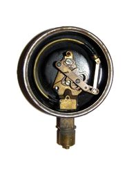 - Indicator needle axle. This has a spur gear that engages the sector gear (7) and extends through the face to drive the indicator needle. Due to the short distance between the lever arm link boss and the pivot pin and the difference between the effective radius of the sector gear and that of the spur gear, any motion of the Bourdon tube is greatly amplified. A small motion of the tube results in a large motion of the indicator needle.