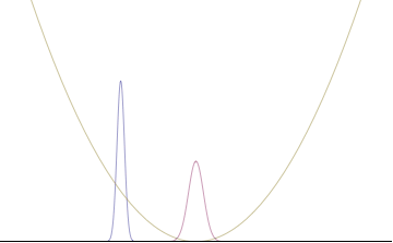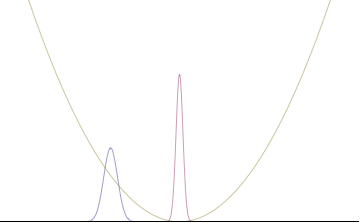 Position (blue) and momentum (red) probability densities for an initial Gaussian distribution. From top to bottom, the animations show the cases Ω = ω, Ω = 2ω, and Ω = ω/2. Note the tradeoff between the widths of the distributions.