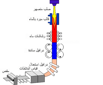 من التطويرات الحديثة الهامة في السباكة اختراع ماكينة الصب المستمر (شكل 5). في هذه التقنية تستمر التغذية بالفلز المصهور من الخزان و يسمح له بالتجمد السريع في القالب بحيث لا تبقى في أى وقت إلا بقعة صغيرة منصهرة أعلى القالب. و عند خروج الصبة المتجمدة من القالب تمسكها مجموعة منالدرافيل تنظم عملية نزولها و تشكيلها. و يؤدى انكماش الفلز المتجمد إلى جذبه بعيداً عن جدران القالب. و يوجد بعد منصة الدرافيل لهب أكسى أستيلين يستخدم لقطع الصبات الخارجة بأطوال مناسبة (شكل 6). و هذه الطريقة مهيأة لعمليات الإنتاج الضخمة ، فهى تنتج قليل من المرتجعات مقارنة بسباكة القطع ، و تخلو مصبوباتها من الفجوات لأن الفلز يتجمد بمجرد صبه ، و منتجاتها صغيرة الحبيبات بسبب التبريد السريع. و هى أيضاً أجدى اقتصادياً حيث يُشَكل الفلز المصهور مباشرة ، في حين أنه في عمليات سباكة القطع تسخن الصبات المتجمدة قبل التشكيل.