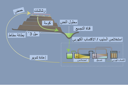 فى هذه الطريقة، تخلى منطقة من النباتات ثم تسوى بميل قليل و تكبس و تغطى بطبقة زِفْت (قِير) أو فَرْخ بلاستيك لين، و تنقل الخامة المجروشة من المنجم إلى الموقع المجهز بشاحنات تفريغ و تُكَوَّم حتى ارتفاع 10 – 15 متر. يرش بعد ذلك العامل الناض على قمة الكومة فيترشح خلالها إلى الأسفل و يجمع محلول النض بعد ذلك في مجارى من القاع.