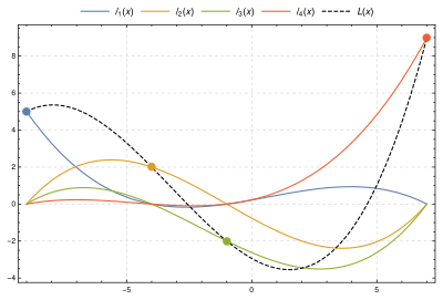هذه الصورة تظهر استيفاء كثير الحدود التكعيبي L(x) لأربع نقاط ((−9, 5), (−4, 2), (−1, −2), (7, 9))، وهو مجموع كثيرات الحدود الأساسية y0ℓ0(x), y1ℓ1(x), y2ℓ2(x) و y3ℓ3(x). استيفاء كثير الحدود يمر خلال جميع نقاط التحكم الأربعة، وكل كثير حدود أساسي يمر خلال نقطة التحكم الخاصة به ويكون صفرًا عندما x متعلقة بنقاط التحكم الثلاثة الأخرى
