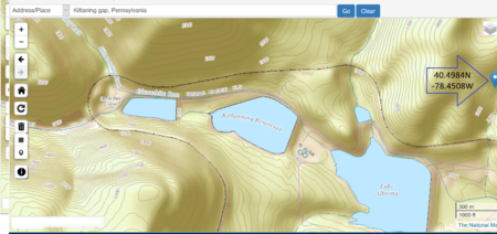 Location of Kittanning Gap after GNIS finding of 'Kittanning Gap, Pennsylvania' seen in USGS National Map viewer screenshot. The gap is located effectively in a western suburb of Altoona, PA.