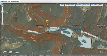 USGS combined topological and relief map mode view with search object 'Kittanning Run'. The Web software identifies the search item with short yellow point icon containing the 'A' (circled). Note that this 'official USGS confluence' is several miles from the official USGS Kittanning Gap.