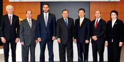 الثالث من اليمين چوي گوانگ-چول رئيس إس كي للهندسة والإنشاءات، ووزير الخارجية المصري نبيل فهمي، ثم باسل الباز رئيس كربون القابضة، وفي أقصى اليسار: رئيس مجلس ادارة كربون القابضة. في مقر إس كي، سول، كوريا الجنوبية، 17 ديسمبر 2013.