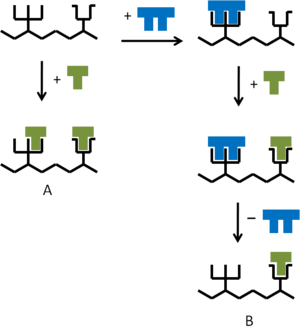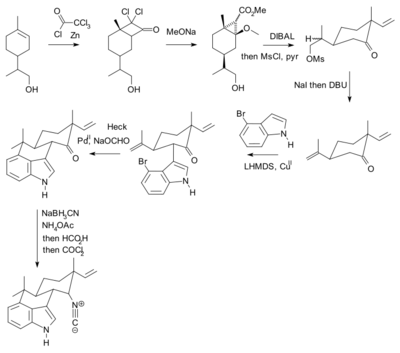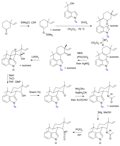 ![]() Hideaki Muratake's 1990 synthesis using Tosyl protecting groups (موضحة بالأزرق). |