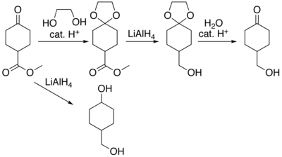 تستخدم مجموعات الحماية على المركبات الكيميائية سهلة التفاعل في بعض تفاعلات الاصطناع العضوي، التي تتطلب استخدام كواشف كيميائية قوية، مما يلزم حماية بعض المجموعات الوظيفية في تلك المركبات. على سبيل المثال، يتصف كاشف هيدريد ألومنيوم الليثيوم LiAlH4 بأنه من المختزلات القوية القادرة على اختزال الإسترات إلى كحولات، ولكن في حال وجود مجموعة كيتون إضافية في الإستر، فإن LiAlH4 سيقوم باختزالها أيضاً، مما يتطلب حمايتها، وذلك عن طريق إجراء تفاعل أستلة عليها في الأول، وتحويلها من كيتون إلى أسيتال، ومن ثم يتم الاختزال بالهيدريد. بعد إتمام الاختزال تزال مجموعة الحماية عن الكيتون بالمفاعلة مع الحمض بمرحلة تسمى إزالة الحماية.