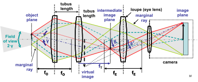 يتضح سير الأشعة الضوئية في المجهر المركَّب، وفيه تجعل العينة على بعد من العدسة الجسمية أكبر من بعدها المحرقي بقليل، فتشكل للجسم المفحوص خيالاً حقيقياً مقلوباً وأكبر من الجسم، يقع بين رأس العينية ومحرقها، وتشكل له هذه العدسة الأخيرة خيالاً وهمياً مكبراً ومقلوباً، هو مايراه الناظر في عينية المجهر. ولما كان الخيال النهائي قد كُبِّر في مرحلتين، فإن التكبير النهائي للجسم المفحوص في المجهر يساوي جداء تكبيري العدستين الجسمية والعينية. فإذا كان تكبير العدسة الجسمية أربعين مرة (40×) وتكبير العدسة العينية عشر مرات (10×) أمكن الحصول على تكبير نهائي مقداره أربعمئة مرة (400×).