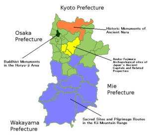 العديد من الجينجات (معابد الشنتو) ومعابد البوذية، وكـُفون توجد في محافظة نارا، وهي مركز للسياحة. Moreover, many world heritage sites, such as the temple Tōdai-ji and Kasuga Shrine, توجد في العاصمة نارا.