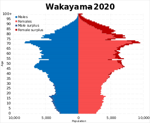 Since 1996, population of Wakayama Prefecture has kept declining, and since 2010, it has been the only prefecture in Kansai region with population below 1,000,000. In 2017, Wakayama is ranked 40th by population in Japan with a population of 944,320. In the 2020 census, close to 32% of the population was over 65 years of age - the highest percentage in Japan and one of the highest for national subdivisions worldwide.[5]