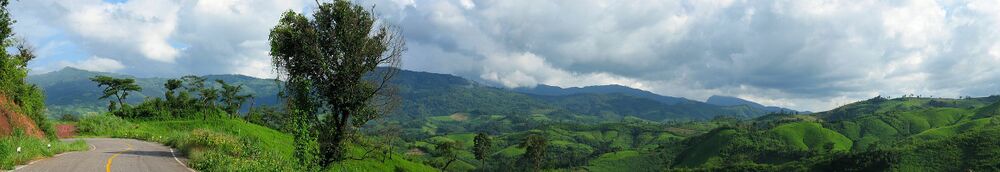 While the eastern part of the province is characterized by relatively flat river plains, the northern and western part consists of the hilly terrain of the Thai highlands with the Khun Tan Range and the Phi Pan Nam Range in the west and the Daen Lao Range in the north. While not the highest elevation of the province, the 1،389-متر (4،557 ft) high[2] Doi Tung (Flag Hill) is the most important terrain feature. Wat Phra That Doi Chom Thong wat on top of the hill, according to the chronicles, dates back to the year 911. Nearby is Doi Tung Royal Villa, former residence of the late princess mother Somdej Phra Srinagarindra (mother of King Rama IX). Thanks to her activities the hills were reforested, and the hill tribes diverted from growing opium poppies to other crops including coffee, bananas, coconuts, and pineapples. The total forest area is 4،585 km2 (1،770 sq mi) or 39.9 percent of provincial area.[3]