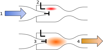 أن الهواء يدخل من فتحتين، ثم يختلط بالوقود وينفجر عن طريق المشعل، وعند الإنفجار تتولد طاقة دفع.