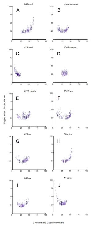 Ten classes of eukaryotic promoters and their representative DNA Patterns. The representative eukaryotic promoter classes are shown in the following sections: (A) AT-based class, (B) CG-based class, (C) ATCG-compact class, (D) ATCG-balanced class, (E) ATCG-middle class, (F) ATCG-less class, (G) AT-less class, (H) CG-spike class, (I) CG-less class and (J) ATspike class.[17]