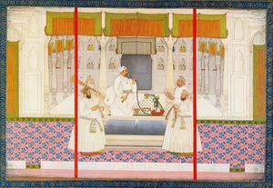 ناصر الدين محمد شاه إرخواز، أبو الفتح ناصر الدين روشن أختر محمد شاه (17 أغسطس 1702 – 26 أبريل 1748)، كان سلطان المغل بين 1719 و 1748.[1][2][3][4] He was son of Khujista Akhtar, the fourth son of Bahadur Shah I. Ascending the throne at 17 with the help of the Sayyid Brothers, he later got rid of them with the help of Asaf Jah I. Hussain Ali Khan was murdered at Fatehpur Sikri in 1720, and Syed Hassan Ali Khan Barha was fatally poisoned in 1722.[5] Muhammad Shah was a great patron of the arts, including musical, cultural and administrative developments. اسمه الأدبي المستعار هو سعادة رنگيلا ("دائم السعادة") وكثيراً ما يشار إليه بإسم "محمد شاه رنگيلا".[6]