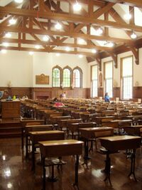 The Chapel's large size reflects the school's dual role as high school and parish church (cf. Christ Church, Oxford). Local landowners James and Prescott Lawrence donated the land for the campus on the understanding that the school would serve as the town's parish church, as there was no Episcopal church in Groton.[11] In 1950, the school's pastoral responsibilities were transferred to its satellite church in Ayer.[160]