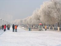 Jilin City is a popular destination for tourists to come each winter to view the magnificent rime ice (雾凇; 霧凇) on trees along the banks of the Songhua River, (the river is the only river in the region that does not freeze in winter). The rime ice is a natural phenomenon that occurs every year during January and February. It is a result of water vapor rising up from the warm Songhua River to meet the cold −20 °C (−4 °F) night air, causing the crystallisation of water vapour on willows branches.