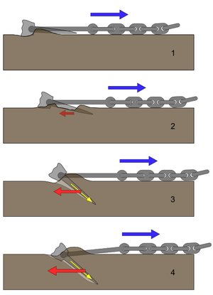 - تصميم الجرافة وهو يشبه تصميم المحراث الزراعي القديم وهي مصممة لدفن نفسها في القاع لاكتساب قوتها وتعتبر جيدة الأستخدام في كافة الظروف تحت الأعماق سواء كانت التربة طينية أو صخرية. وتصميمات البحر الشمالي تملك أشكال متعددة من الجرافات في كيفية عملها وكيفية دفنها لنفسها في أعماق المياه اعتمادا علي شكلها.