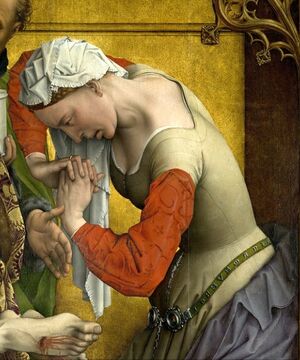 Detail of Mary Magdalene weeping at the crucifixion of Jesus, as portrayed in The Descent from the Cross (1435ح. 1435) by the Flemish artist Rogier van der Weyden[24]