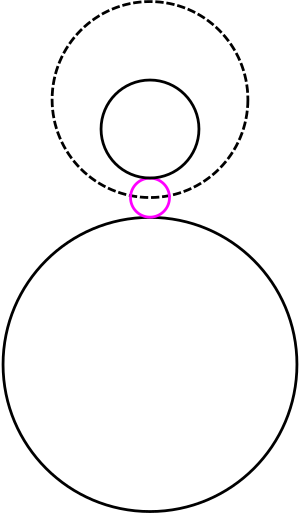 The solution circle may be either internally or externally tangent to each of the given circles. An external tangency is one where the two circles bend away from each other at their point of contact; they lie on opposite sides of the tangent line at that point, and they exclude one another. The distance between their centers equals the sum of their radii. By contrast, an internal tangency is one in which the two circles curve in the same way at their point of contact; the two circles lie on the same side of the tangent line, and one circle encloses the other. In this case, the distance between their centers equals the difference of their radii. As an illustration, in Figure 1, the pink solution circle is internally tangent to the medium-sized given black circle on the right, whereas it is externally tangent to the smallest and largest given circles on the left.