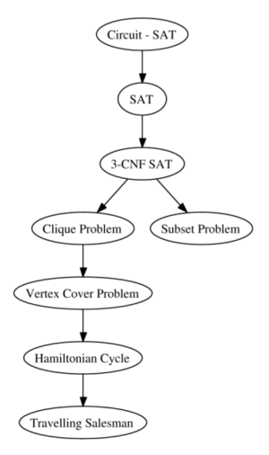 لتحديد وجودية المسائل NP الكاملة، قام كوك و كيفين باستعمال آلة تورينغ للبرهنة على وجود مسألة NP الكاملة، و هي صيغة قيم ثنائية مكونة من عطف عدة صيغ كل صيغة هي مجموعة فصل عدة متغيرات ثنائية أي لها 1 أو 0 كقيمة.