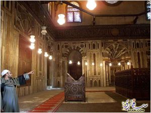 وبإيوان القبلة منبر حجرى جميل محفور به زخارف منوعة أمر بإنشائه السلطان قايتباى سنة 888 هـ، وتقوم أعلى المحراب قبة صغيرة، ويكتنف هذا الإيوان القبتان الكبيرتان المتماثلتان يتوصل إليهما من بابين فتحا على الإيوان المذكور، عليهما حجابان من الخشب على هيئة أشكال هندسية ومدفون بالقبة البحرية السلطان برقوق في المكان الذى أوصى بدفنه فيه عند أقدام بعض الفقراء كما دفن بها وبالقبة القبلية بعض أولاده وحفدته.