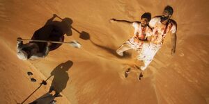 لكن صوت صرير سَن السيف لن يسكته صراخه. حتى عبد الرحيم وعلي الذي قام لتوه بصرف مكافأة تسليم رشاش، يبدو أنهما لن يستمتعا بالأموال، فقد علم زعيم القبيلة اليمنية بالصفقة التي تمت بعيداً عنه، فتورايهم رمال الصحراء غارقين في دمائهم.