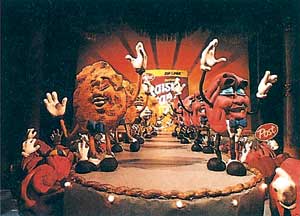 التحريك بالصلصال يتم باستخدام نماذج من الصلصال عوضًا عن الرسم. تبين الصورة (إلى اليمين) أحد الإعلانات التلفازية عن المواد الغذائية، وقد استخدم هذا الأسلوب من التحريك لإنجاز الفيلم.