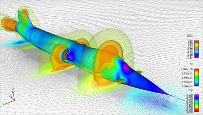 تظهر دراسة ديناميكا الموائع الحسابية سريان الهواء حول السيارة. اللون البرتقالي يظهر المناطق التي تقترب سرعة الهواء فيها من سرعة الصوت، واللون الأزرق مناطق تباطؤ التيارات الهوائية.[1]