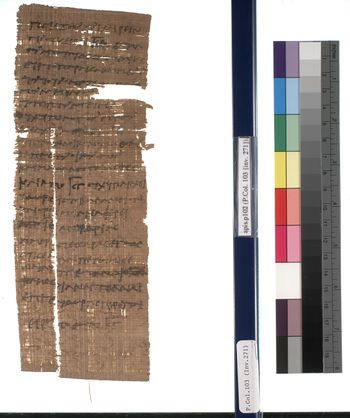 پايس إلى زينون، تحياتي. اِعلم أني خرجت من السجن يوم 21. ولقد وجدت محصل ضرائب العمدة جالساً خارجه. وبدون أي خصم، أخذ مني كافة المستحقات كتأمين. خذ في اعتبارك كيف يجب علينا ترتيب أمورنا مع المحصل ولا تهمل الموضوع. من يوم 23 لا يوجد ماء في الحمام العمومي. وهوروس أرسل بلاغاً ضدي بانقطاع الماء لمدة 4 أيام بدءاً من يوم 15. لقد نفيت أن أكون قد فعلت تلك الأشياء. إلى أن يخبرك ديوكليس، فقد ذهب لتدبير ماء. الوداع. 23 توت. إلى زينون.