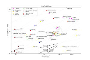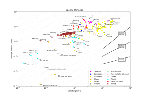 المادة | معامل ينگ (GPa) | الكثافة (گ/سم³) | Young's modulus per density; specific stiffness (106 m2s−2) | Young's modulus per density squared (103 m5kg−1s−2) | Young's modulus per density cubed (m8kg−2s−2) |