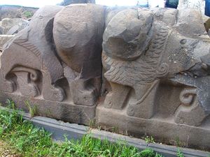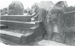 عُثر على التماثيل الثلاثة بجوار معبد عين دارا، وهي عبارة عن تماثيل عملاقة تصور أبي الهول والأسود مزخرفة من جميع الجهات. لم يتم اكتشاف أي مباني آخرى مماثلة لهذا المعبد.