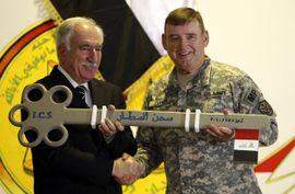 الجنرال جيري كانون يسلم مفتاح آخر المعتقلات الأمريكية في العراق لوزير العدل العراقي، يوليو 2010.