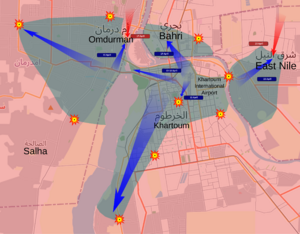 أفادت التقارير في البداية أن التوترات تصاعدت في الخرطوم ومروي في 13 أبريل 2023، عندما احتشدت قوات الدعم السريع.[26] رداً على ذلك، أصدرت القوات المسلحة السودانية بيانًاً قالت فيه "هناك احتمال وقوع مواجهة بين القوات المسلحة السودانية وقوات الدعم السريع"، مما أثار مخاوف من اندلاع صراع أوسع نطاقاً.[27] في مساء 14 أبريل 2023، هاجمت قوات الدعم السريع مطار الخرطوم الدولي، الذي يتضمن قاعدة عسكرية، والقصر الرئاسي. وامتد القتال من الخرطوم إلى ضواحيها، وخاصة أم درمان، حيث سيطرت قوات الدعم السريع على جزء كبير من جسرها الممتد على النيل الأبيض.[28] في 26 مارس 2025، أعلنت القوات المسلحة السودانية انتصارها بعد طرد قوات الدعم السريع من معظم أنحاء الخرطوم، بما في ذلك المطار والقصر الرئاسي.[5][6][7][8]
