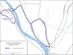 The Battle of Trenton was a small but pivotal battle during the الحرب الثورية الأمريكية which took place on the morning of December 26, 1776, in Trenton, New Jersey. After General George Washington's crossing of the Delaware River north of Trenton the previous night, Washington led the main body of the Continental Army against Hessian soldiers garrisoned at Trenton. After a brief battle, nearly the entire Hessian force was captured, with negligible losses to the Americans. The battle significantly boosted the Continental Army's flagging morale, and inspired re-enlistments.