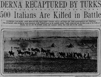 صحيفة "سان فرانسسكو كول" في 7 نوفمبر 1911، عن حرب طرابلس: الأتراك يستولون على درنة. مقتل 500 إيطالي في المعركة.