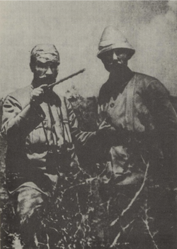 Staff Major Mustafa Kemal (left) dictating his orders in front of the Mujahideen Bedouin Forces, (Derne, Tripoli Province (Libya), 1912) | |||||||