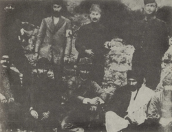 ![]() وفد الهلال الأحمر في درنة. الجلوس من اليسار: كبير الأطباء العسكريين إبراهيم تالي بك، مصطفى كمال، أنور بك، يوسف شتوان، نوري جونكر. |