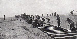 The campaign across the Sinai desert, which had begun in August, ended with the expulsion of the Ottoman Empire from Egyptian territory. With the victory at Rafa, the steady progress of the railway and pipeline, and the build up of supplies at El Arish, the EEF was able to build a firm base from which to advance into Ottoman territory. But to do so would require the capture of Gaza; the First Battle of Gaza was fought in March 1917.[52][50][61]